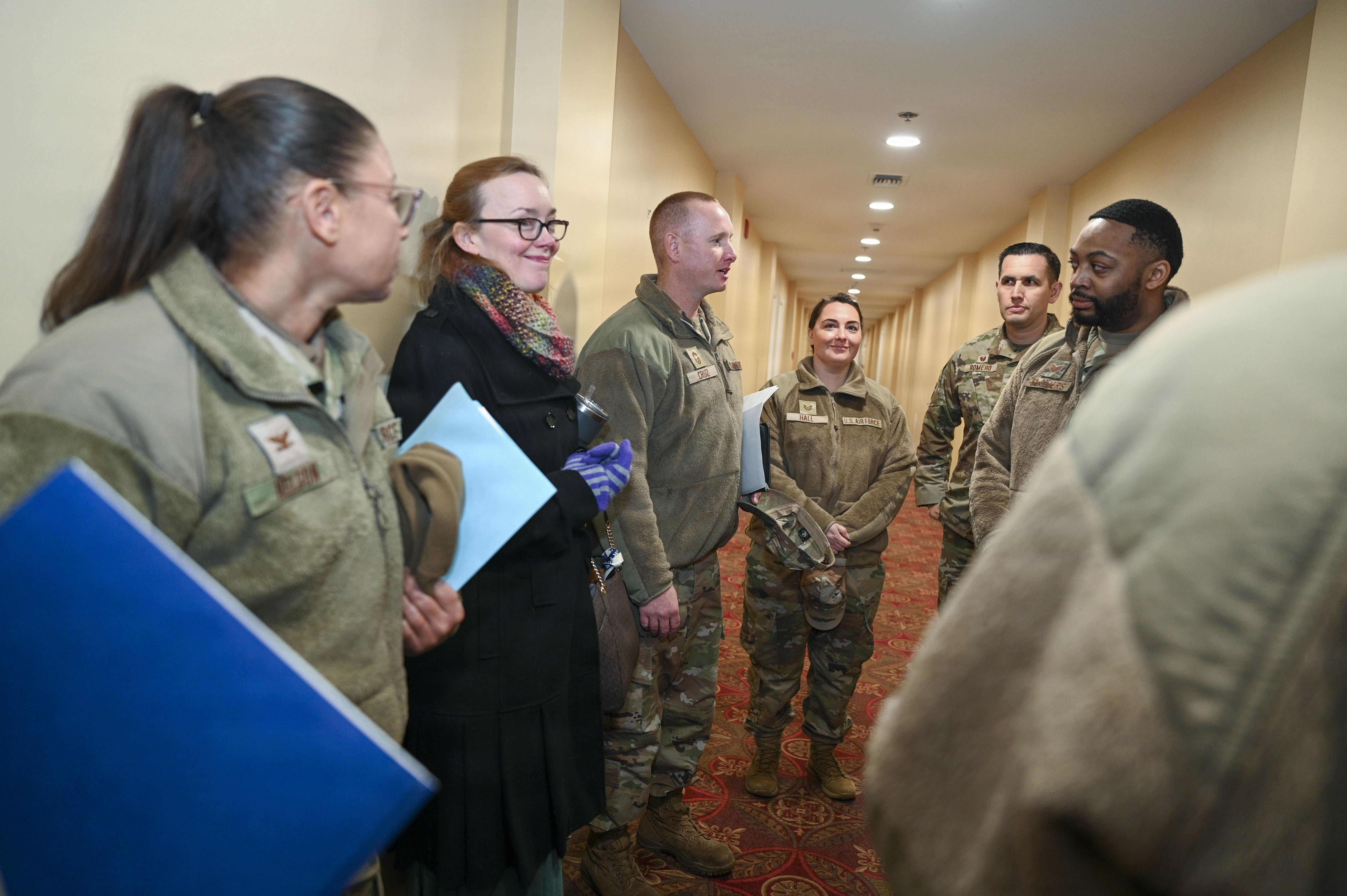Members of the 11th Wing commander’s action group conduct a tour with Adam Dontz, right, Deputy Assistant Secretary of War for Housing, at the Furnari Hall unaccompanied service member housing facility on Joint Base Anacostia-Bolling, Washington, D.C., Dec. 9, 2025. The group met to tour existing housing facilities and discuss housing improvement projects for JBAB. (U.S. Air force photo by Airman 1st Class Shanel Toussaint)