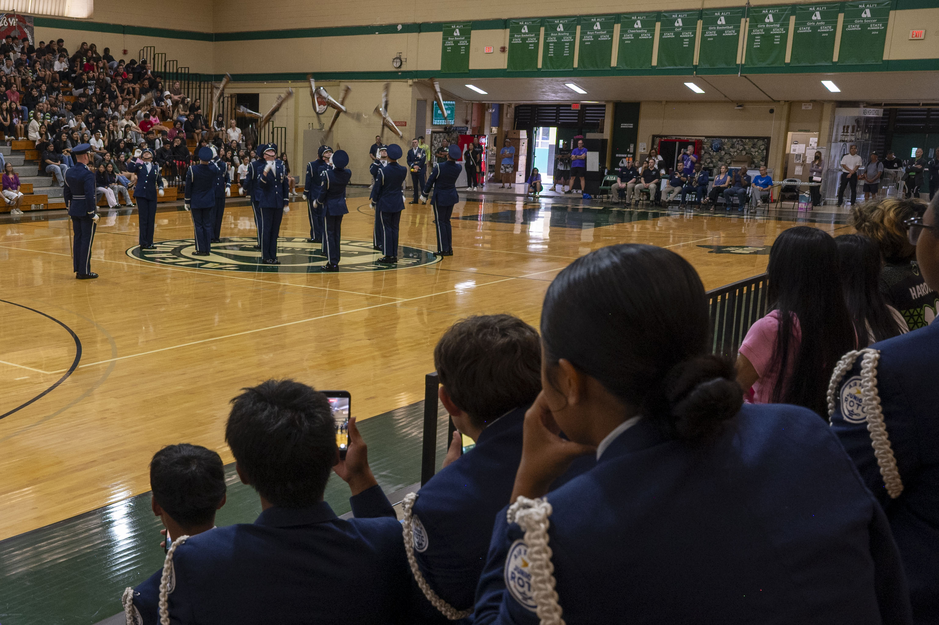 Aiea High School U.S. Air Force Junior Reserve Officer Training Corps cadets watch as the U.S. Air Force Honor Guard Drill Team performs in Aiea, Hawaii, April 2, 2026. The teams interacted after the performance, discussing drill and ceremony and the Air Force experience. (U.S. Air Force photo by Staff Sgt. Jordan Powell)