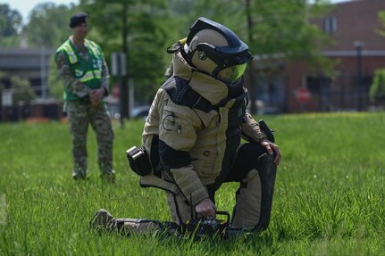JOINT BASE ANACOSTIA-BOLLING, Washington, D.C. - U.S. Air Force Senior Airman Jacob Hudson, an Explosive Ordnance Disposal specialist assigned to the 316th Civil Engineer Squadron, examines a simulated suspicious package during a Combat Readiness Inspection at Joint Base Anacostia-Bolling, Washington, D.C., May 1, 2025. The 11th and 316th Wings demonstrated rapid deployment capabilities and crisis response throughout the inspection. (U.S. Air Force photo by Airman 1st Class Geneva Nguyen)